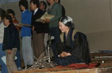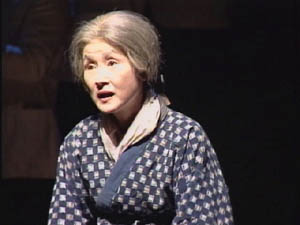 昭和55年、創立30周年の年、日本音楽集団の伴奏で演奏したいという長井先生の依頼で、 三木先生が先生の教え子でもあり、音楽集団に在籍していた内田とも子さんに依頼し 和楽器での伴奏が完成した。 ナレーターには音楽集団の紹介で劇団「民芸」の女優 南風(みなかぜ)洋子さんを迎えた。 老婆に扮した南風さんの演技はサスガ!といえるもので団員は練習中 話に聞きほれ音もおぼつかないほどだった。 |