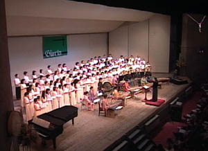 この曲を演奏するのは4回目となるこの年は、ナレーターに女優の高田敏江さん、 そして日本音楽集団の皆さんを再びお迎えし演奏した。 演奏会に先駆け、音楽集団との合わせのため10名ほどが東京の練習場へ出向いた。 この時は高田さんもナント来てくださったのであった。 そして創立50周年記念演奏会のメーンを飾る素晴らしいステージとなった。 |