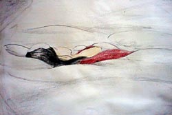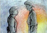 けれど眠りの少ない夜が続いて、疲れた若者の顔は だんだん青ざめ、やつれていった それと同時に、心の中に娘へのうとましさや、疑いが巣くって行った そしてそれがだんだん大きくなった ある夜、若者は山路のものかげに隠れて娘を待った やがてひた走る娘の足音が聞こえた 黒い影がその娘に向かって躍り出した 娘は崖をはずみながら落ちていった 長い悲鳴が尾を引いて闇の中に消えた |