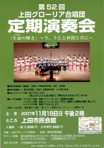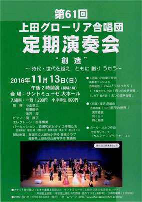 柳澤 順子 : ソプラノ独唱 滝沢 深 : 作曲&ピアノ 宮下 靖弘 : テノール独唱 小野沢玲子 : ピアノ独奏&デュオ 賛助出演 : 相馬由美子 上田グローリア合唱団 主催:上田グローリア合唱団 左 信濃毎日新聞より |