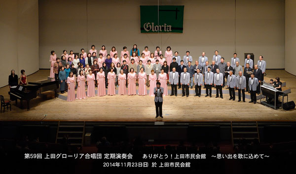 | 「絆・希望・そして未来へ」 オープニング 上田グローリア合唱団の歌 歌声は風に乗り 上田グローリア合唱団作詞 小山章三作曲 1.混声合唱曲集 「かなしみはあたらしい」 谷川俊太郎詩 信長貴富作曲 1.歌っていいですか 2.泣いているきみ 3.かなしみはあたらしい 4.未来へ 2.混声合唱とピアノのための 「中島みゆき」 中島みゆき作詞・作曲 信長貴富編曲 1.時代 2.地上の星 3.糸 4.宙船 5.誕生 <全体合唱>お客様に曲を決めていただき ご一緒に歌いましょう 3. 「サウンド・オブ・ミュージック」 Oscar HammersteinU作詩 Richard Rodrers作曲 1.サウンド・オブ・ミュージック(合唱) 2.アレルヤ(重唱) 伊藤正美 小林法子 小島万左子 柏木道子 3.私のお気に入り(合唱・舞踊) 4.ドレミの歌(合唱・舞踊) 5.ひとりぼっちの羊飼い(合唱・舞踊) ソロ:宮崎礼子 山岸明人 太田千恵子 あらかわひろし 日本語詞 6.エーデルワイス(独唱) 宮下靖弘 7.すべての山に登れ(独唱) 吉澤真弓 8.アレルヤ(合唱) 9.さようなら、ごきげんよう(合唱・舞踊) 北野實編曲 ソロ:箕田優花 赤松涼香 入沢昌基 白鳥理佳 羽毛田克信 宮原永津子 10.すべての山に登れ(合唱・舞踊) |