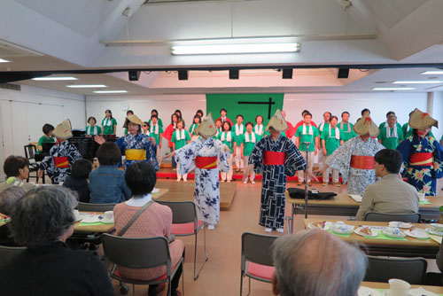 | 「お祭りマンボ」のステージ 数分でお祭りの雰囲気の衣装に着替え。 おじさん役・おばさん役のふたりが熱演! |